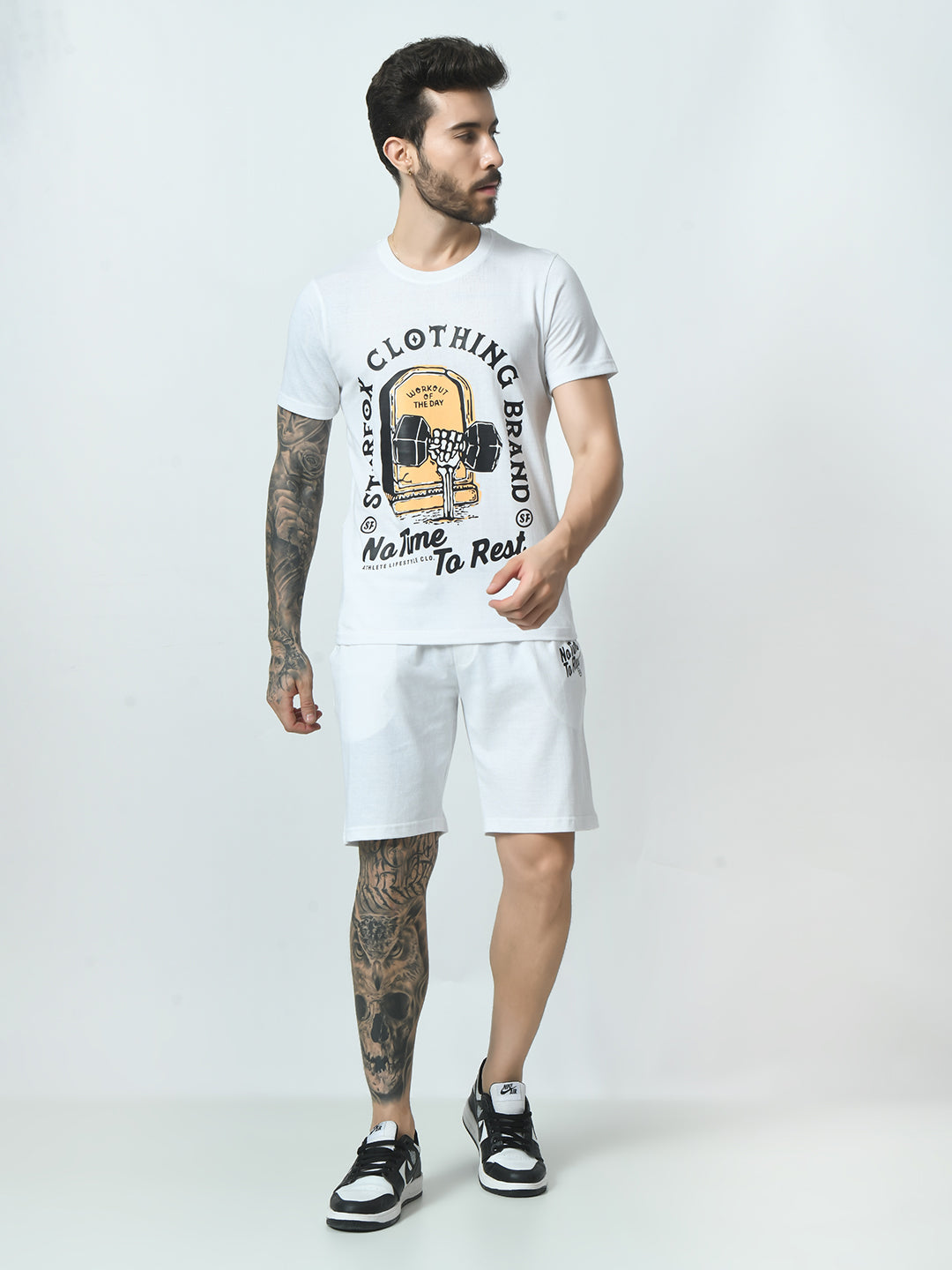 Indulge in pure luxury with our Smoke White Printed T-shirt and Shorts Co-ord Set. Made...