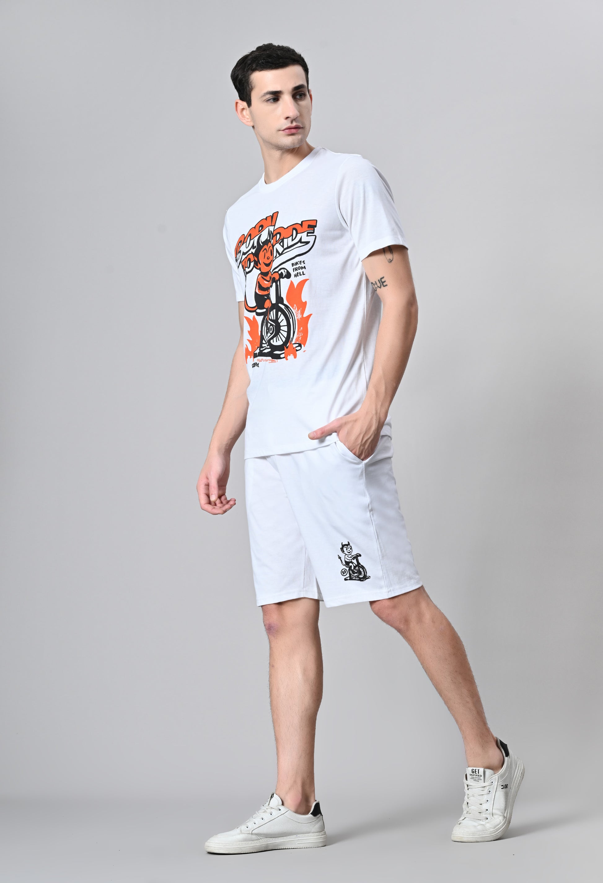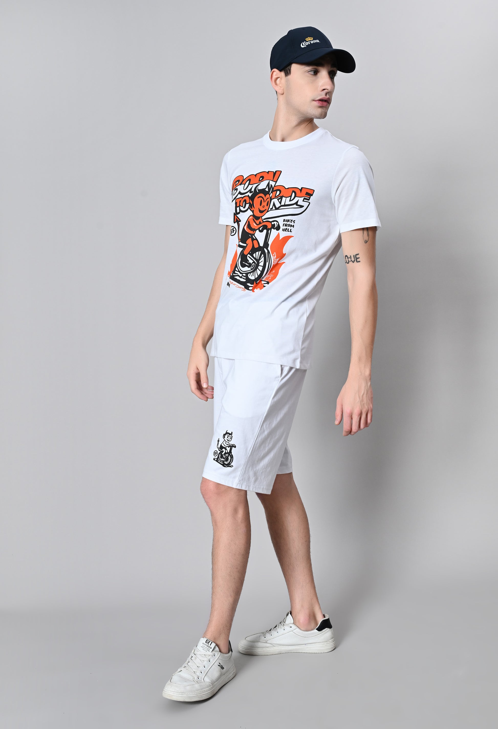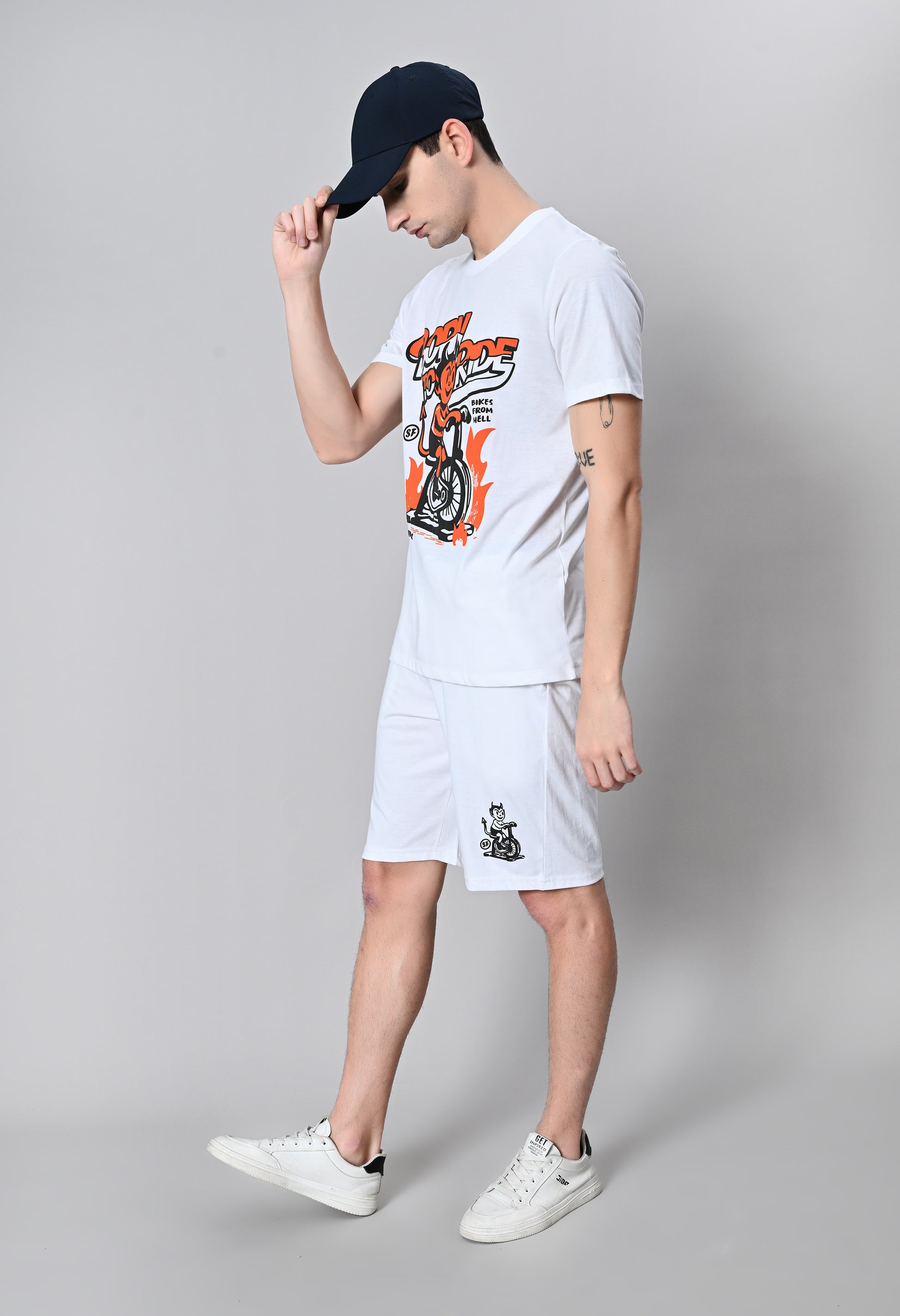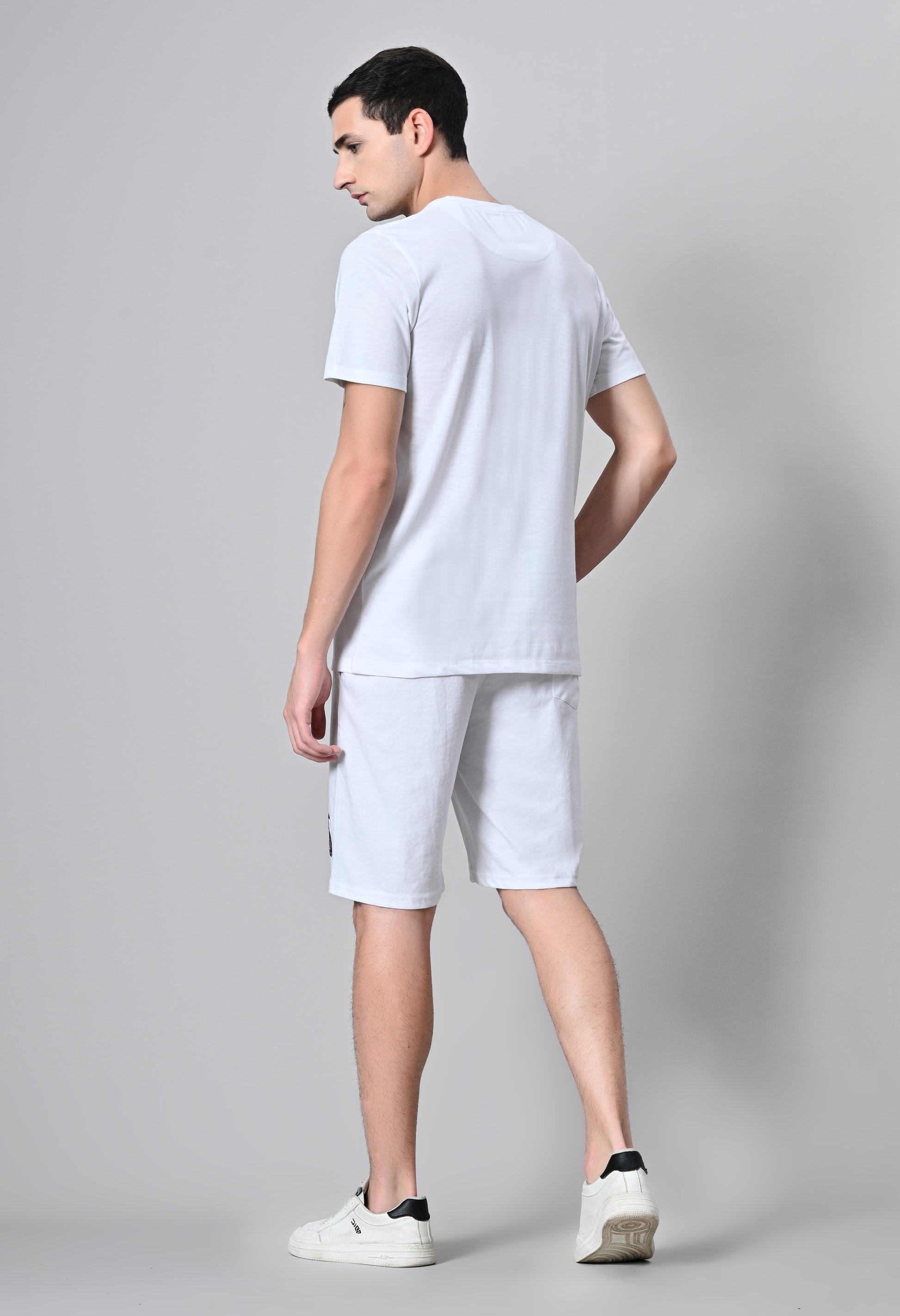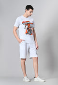Men's White Printed Puff Round Neck With Shorts Co-Ord Set