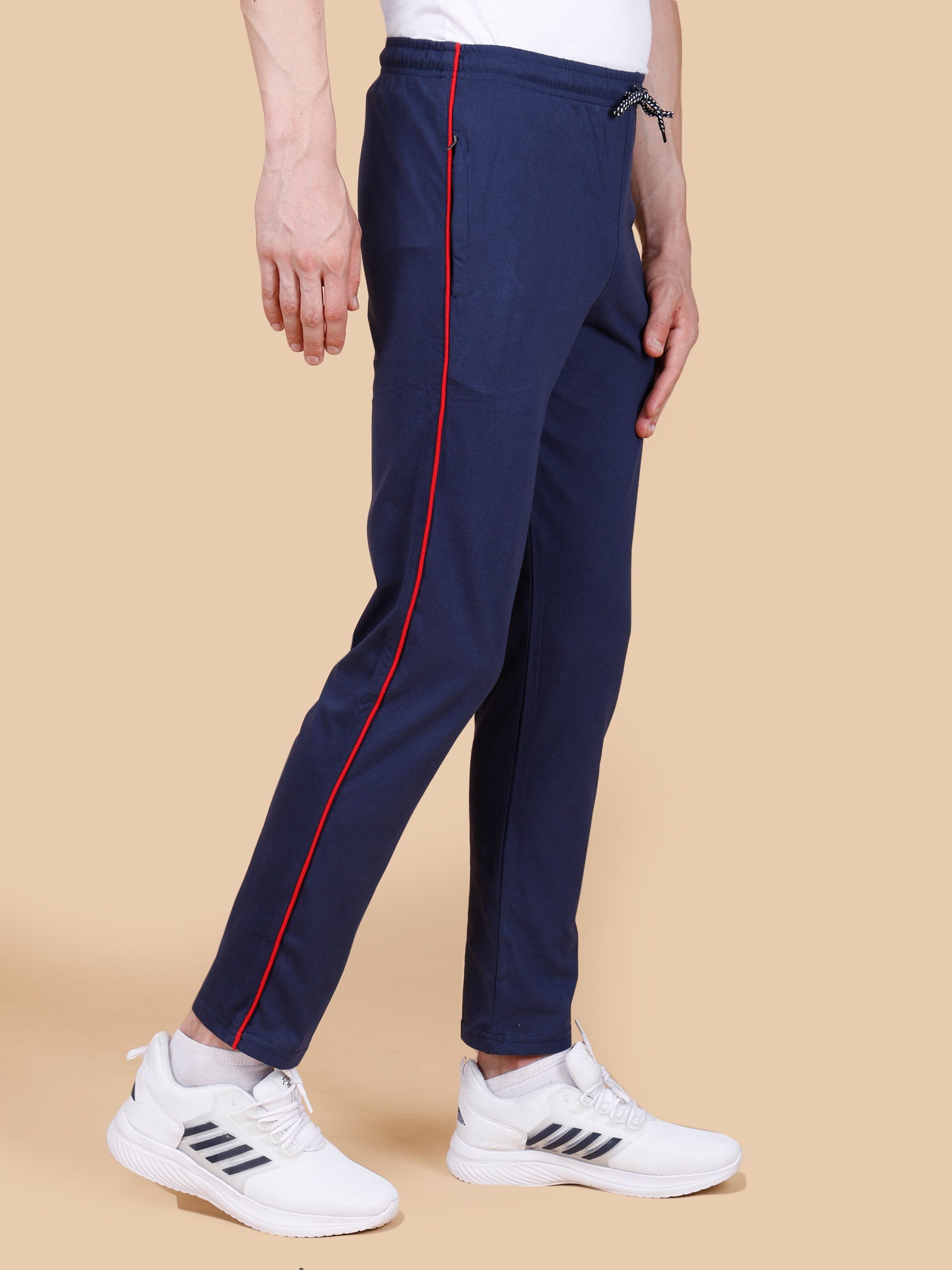 Elevate your athletic style with our Navy Track Pant with Contrast Pipping. The sleek design features convenient side pocket zippers and a dynamic contrast piping, providing both style and functionality. Move freely and confidently with this must-have addition to your workout wardrobe.