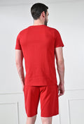 Elevate your style with our Red Printed Round Neck With Shorts Co-Ord Set. Made from recycled fabric, this slim fit co-ord set in a luxurious turkey red color features a printed tshirt, perfect for the fashion-forward individual looking for sustainable and sophisticated pieces.
