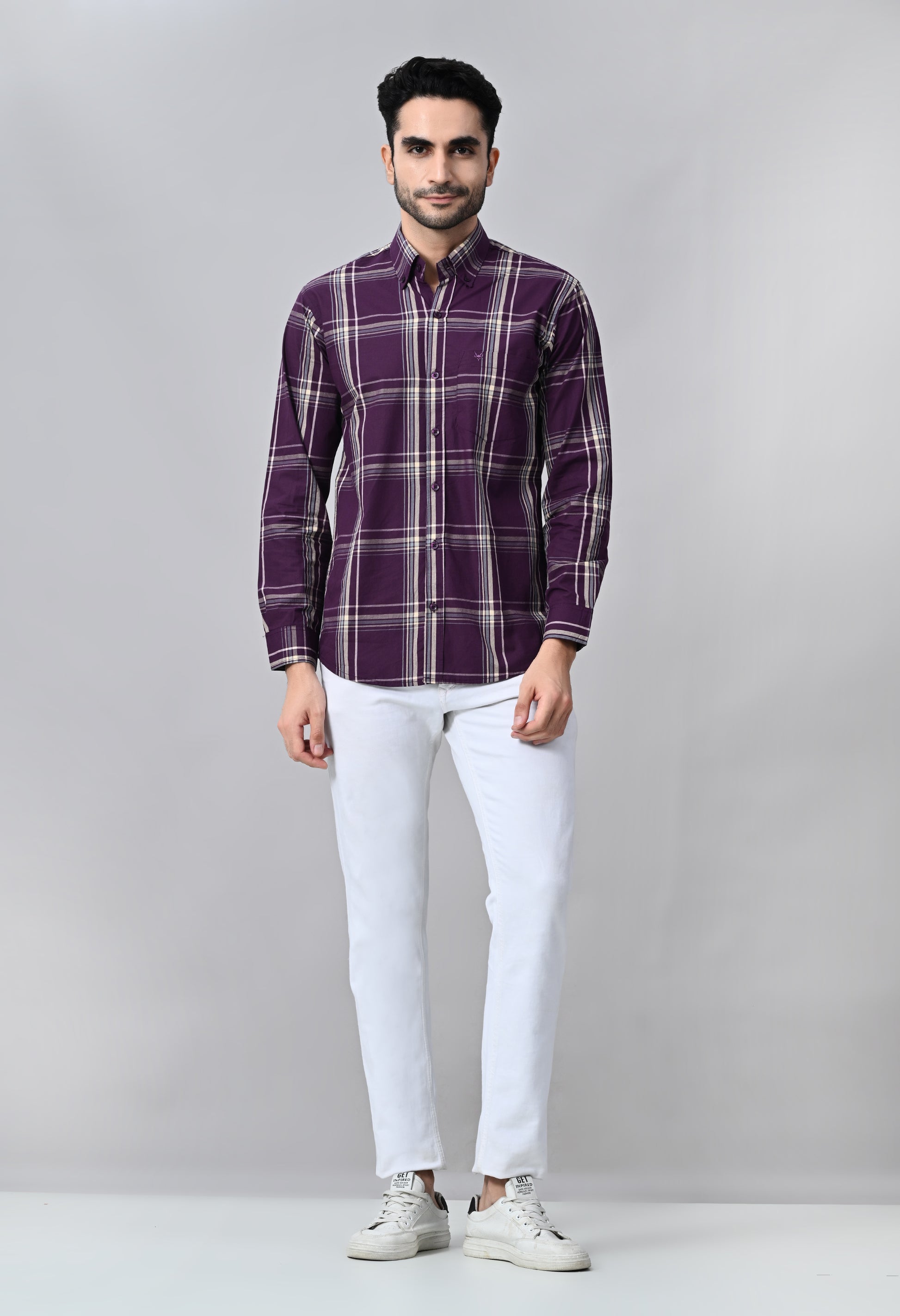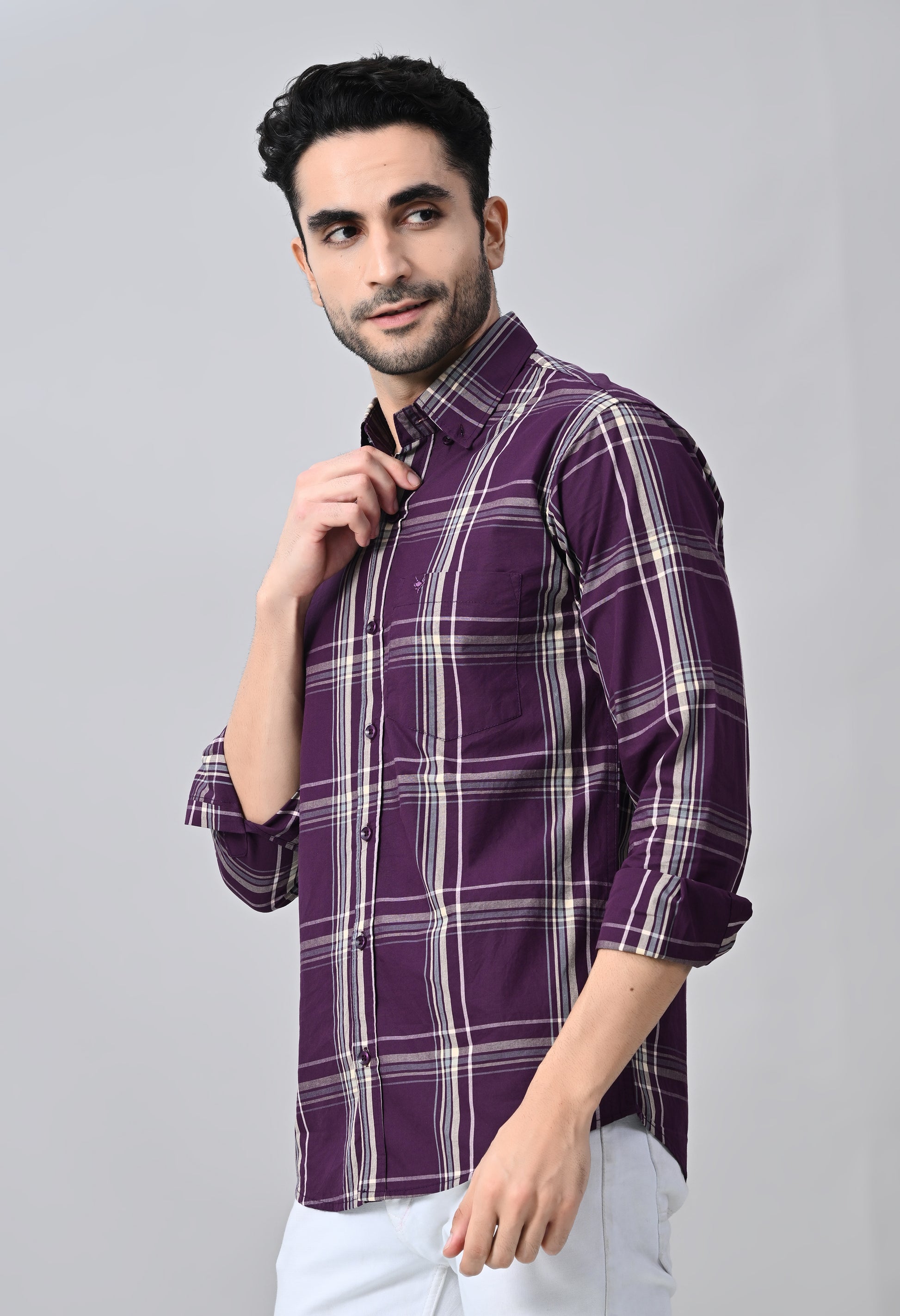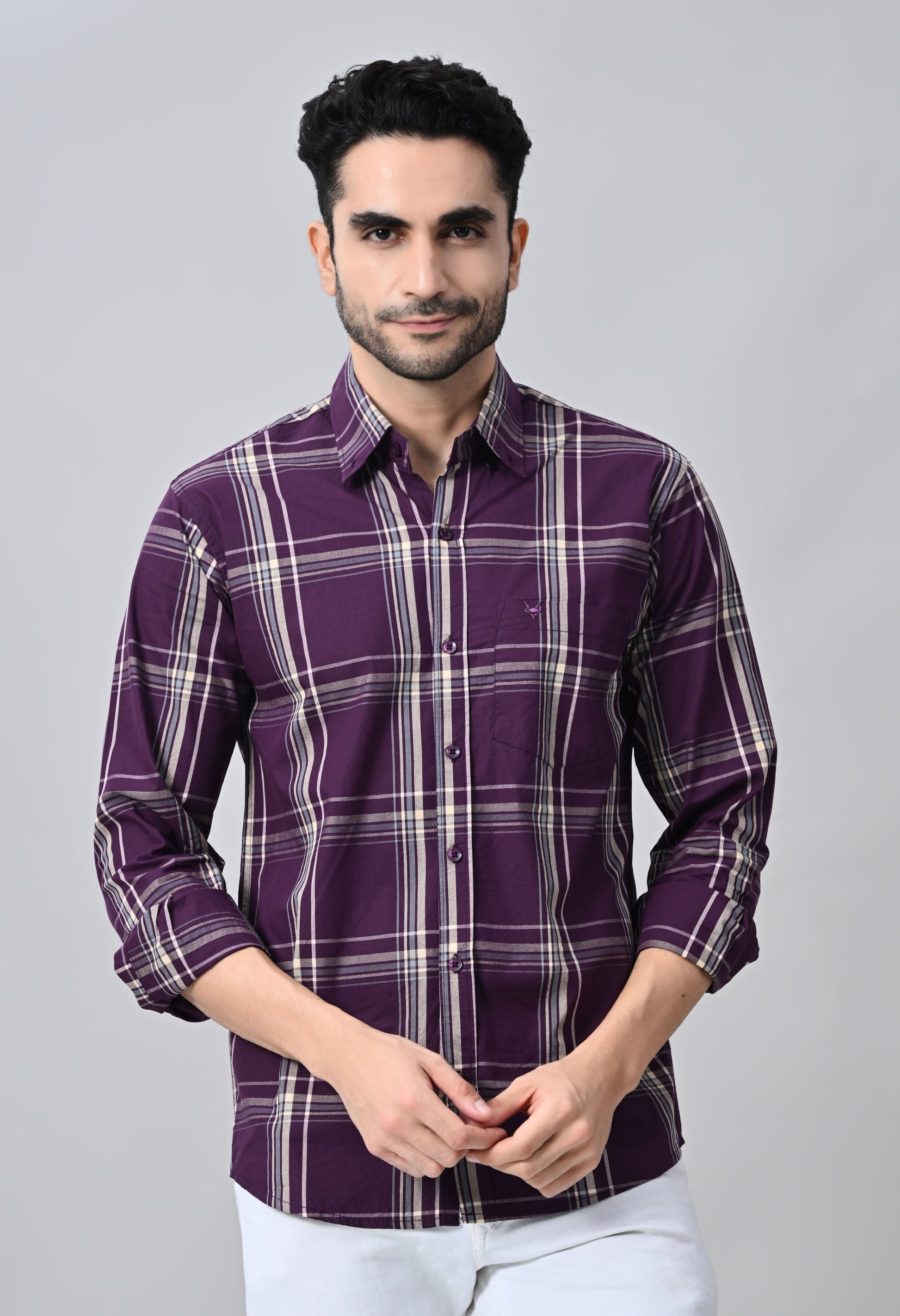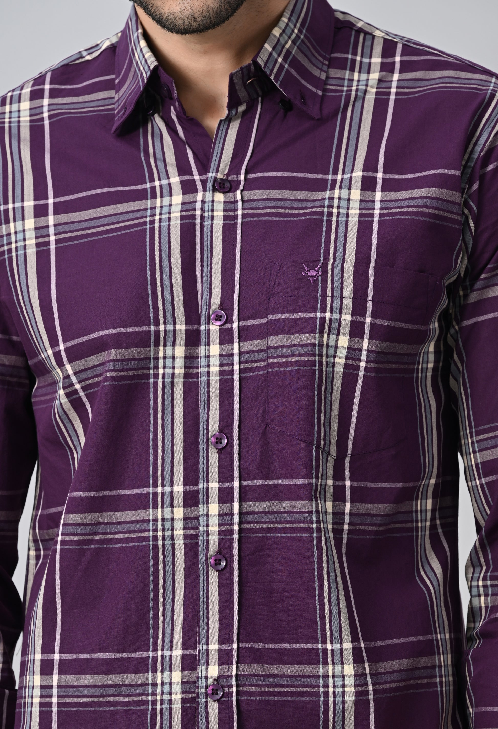 Elevate your formal wardrobe with our Purple Checked Formal Shirt. Crafted with a stylish windowpane check pattern, this shirt exudes sophistication and charm. Perfect for any occasion, it pairs effortlessly with any pants for a polished and put-together look. Make a statement in style and confidence with our formal shirt!